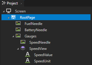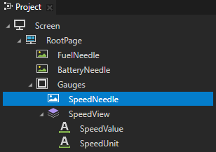 For example, in Kanzi Studio open the project stored in the <KanziWorkspace>/Examples/XML data source/Tool_project directory and select the RootPage > Gauges > SpeedNeedle node. You use the Property Target Interpolator to gradually move the SpeedNeedle node from its previous to the current position when the value of the speed changes in the data source. To learn how to create that project, see Tutorial: Create gauges and Tutorial: Get application data from a data source.