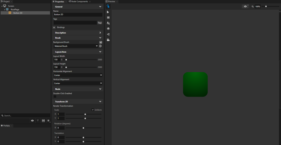 Background Brush to a Color Brush, Texture Brush, or Material Brush that you use to fill the Button 2D node. See Adjusting the appearance of 2D nodes.