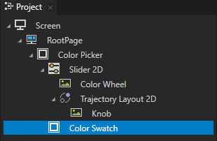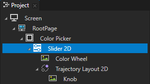 Click Save. This way you bind the value of the Brush Color property to a color value that you calculate based on the Value property of the Slider 2D node. You can bind the Brush Color property of a node that has either the Foreground Brush or the Background Brush property but not both properties. If the node has both Background Brush and Foreground Brush properties, Kanzi Studio does not know to which of the two brushes you want to bind.