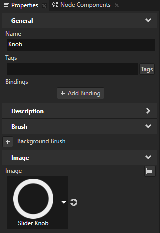In the Project select the Knob node, in the Properties add the Bindings property, and in the Binding Argument Editor set: