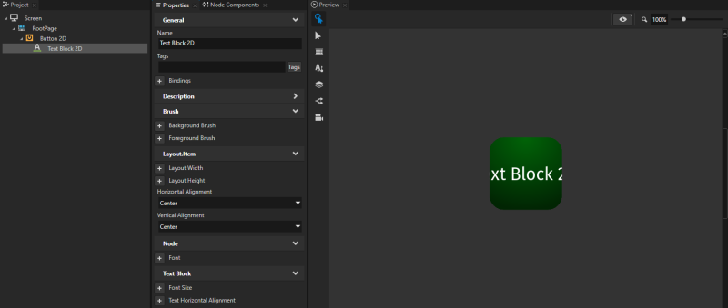 In the Projectpress Alt and right-click the node that you created, select Text Block 2D, and in the Properties add and set the Horizontal Alignment and Vertical Alignment properties to Center.