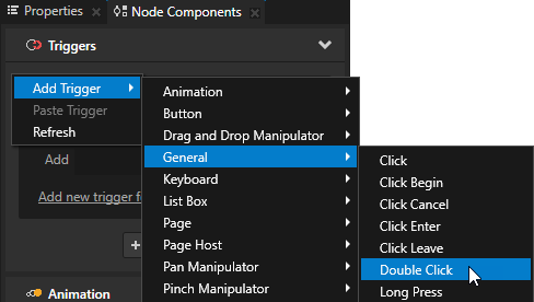 In the Node Components > Triggers section click the Add dropdown menu for the Double Click trigger, select an action, and configure the action. See Using triggers and Actions reference.