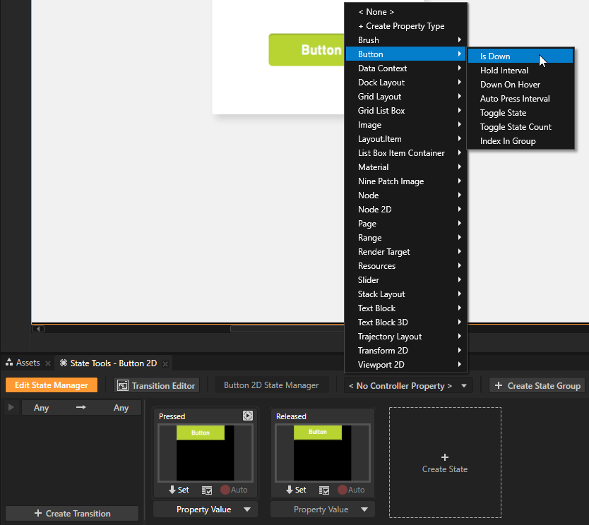 In the State Tools for the state manager which controls the Button states set the Controller Property to Is Down. In a state manager the value of the property you select as the Controller Property defines the conditions when each state in a state group is active. Here you use the Is Down property to transition to a state based on the value of that property. The Is Down property controls whether a Button node is in a pressed or non-pressed state.
