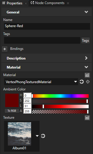 - For each 3D node you selected in the previous step, in the Properties add and set the properties with which you want to change the appearance of the node. Use the properties from the Material category to adjust the materials.