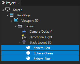 For example, press Alt and right-click the Scene node, create a Stack Layout 3D node and inside it create three Sphere nodes.