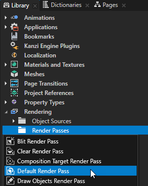 - In the Library > Rendering press Alt and right-click Render Passes and select Default Render Pass.