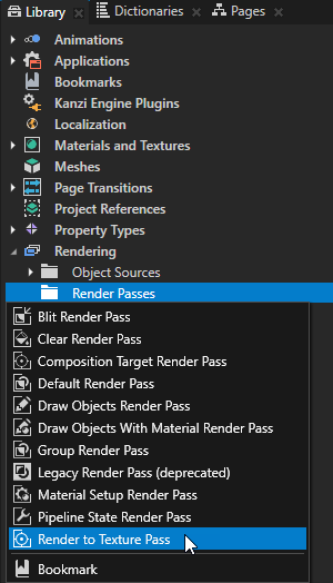 - In the Library > Rendering press Alt and right-click Render Passes and select Render to Texture Pass.