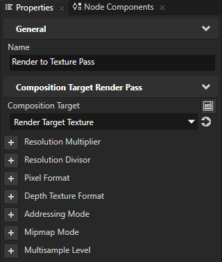 - In Rendering > Render Passes a Composition Target Render Pass named Render to Texture Pass, which renders itself to the Render Target Texture resource, and inside it: