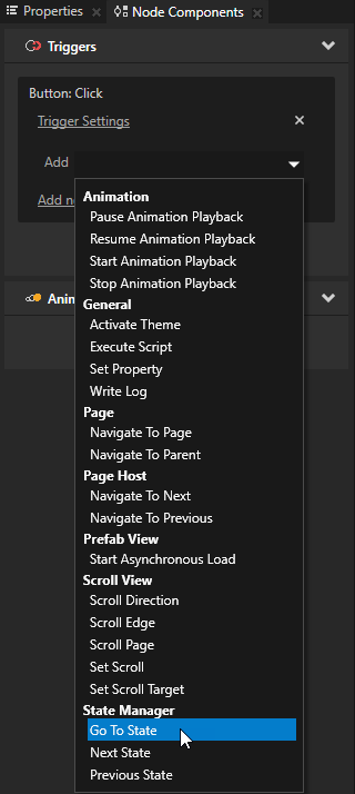 In the Node Components > Triggers section in the trigger, which you want to use to set the state manager to a specific state, click the Add dropdown menu, select the Go to State action, and in the action settings set: