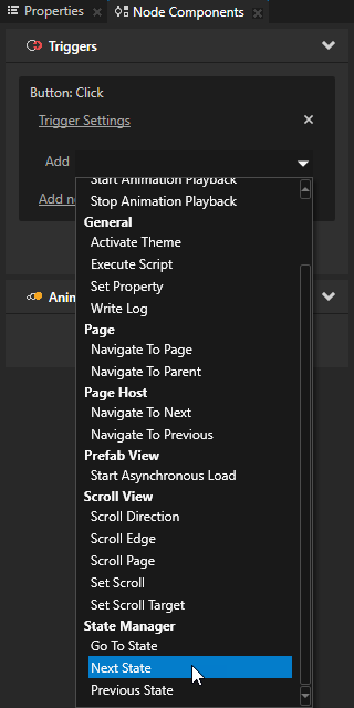 Create or select a node that you want to use to set your application to the next or previous state in a state manager, and add to that node the trigger that you want to use to change the state. For example, create a Button node and add to it a Button: Click trigger. See Using triggers.