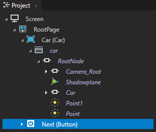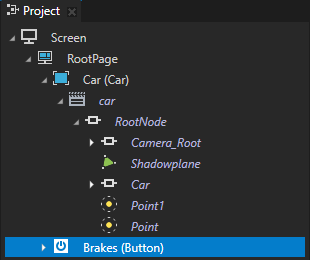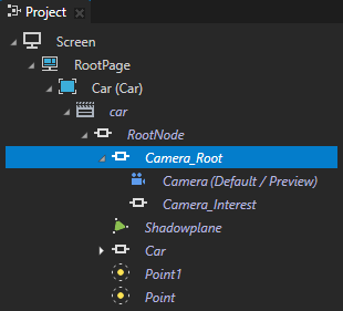 Create a state manager and the states where you set the appearance and behavior of the content that you created in the previous step. See Creating a state manager. For example, create for the Camera_Root node a state manager with three states named Brakes, Roof, and Suspension, that each shows the car from a different angle. See Using the Camera node.
