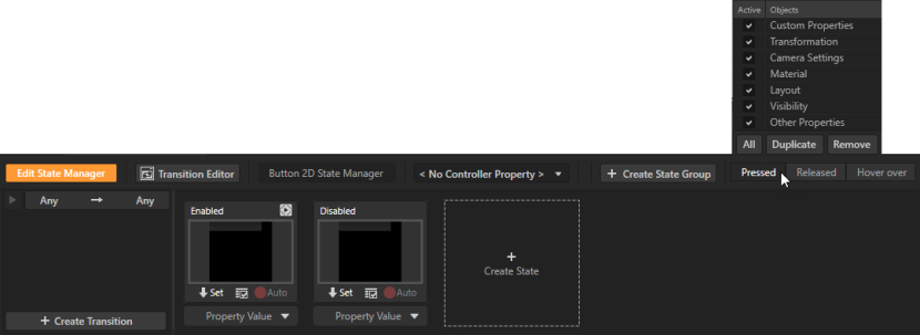 In the State Tools bring the mouse pointer over a state group to set the properties that this state group records. Set different state groups to record the changes in different property values. Use the All to select or deselect all properties. To duplicate or remove a state group, hover over the state group and select Duplicate or Remove.