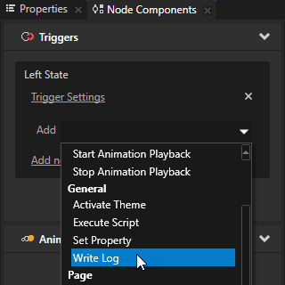 In the Node Components > Triggers section click the Add dropdown menu for the trigger you added in the previous step and select an action. For example, select the Write Log action and enter a message you want to write to the Log window when the trigger is set off. The Write Log action is useful when you want to verify that the node received the input.