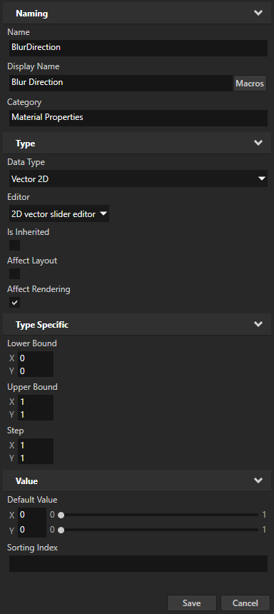 In this section you first create a material type which supports the directional Gaussian blur effect, then you create a material you can use to apply the effect to 3D content.
