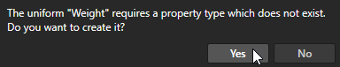 - In the Create Property Type window click Yes to create the custom property type Weight you use to weigh between the Texture0 and Texture1 properties, in the Property Type Editor set the Default Value property to 0,5, and click Save.