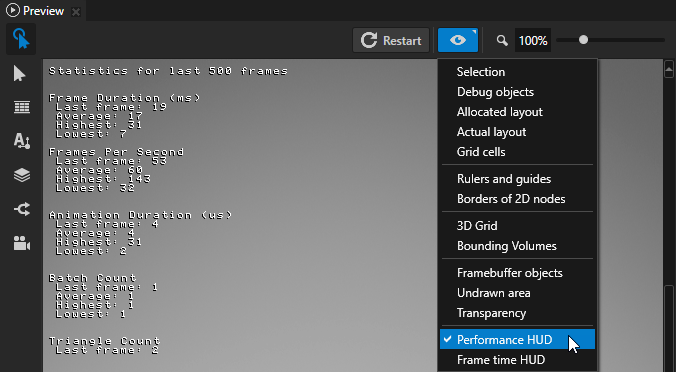 - Performance HUD shows the overall performance indicators of your Kanzi application during the last 500 frames including:
