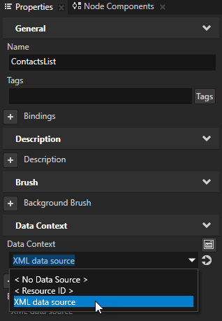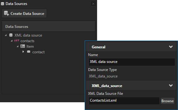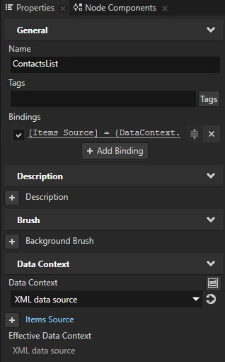 - In the Project select the ContactsList node, from the Data Sources window drag the XML data source > contacts data object, and drop it to the Items Source property of the ContactsList node in the Properties.