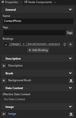 - In the Prefabs in the ContactItem prefab select the ContactPhoto node, from the Data Sources window drag the XML data source > contacts > Item > contact > photo data object, and drop it on the Image property in the Properties. This data object provides the photo for each contact item in the contacts list.