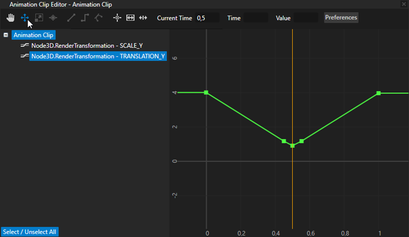 When you drag properties into the Animation Clip Editor to create keyframes, Kanzi Studio automatically adds the Animation Data items for each attribute of the property to that Animation Clip item. Since you changed only Translation Y and Scale Y attributes of the Render Transformation property, you can delete all the other Animation Data items.