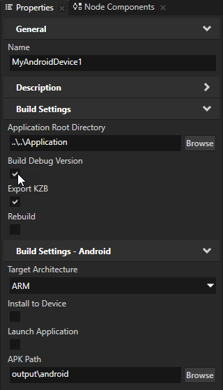 You can configure the building of your Kanzi applications for Android using the application configurations in Kanzi Studio. For example, you can set the target architecture, and whether Kanzi should deploy the built package to the attached target device. You can set which application configuration you want to use when you select > Export > Build Android Package in > in the Default Build Configuration property.