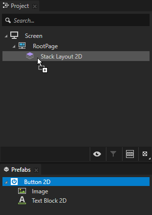 When you drop a node into the Prefabs window, Kanzi Studio creates a prefab template from the node and replaces the original node with an instance of the prefab.