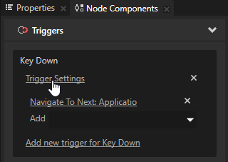 - To set the application to receive input from a particular key on the keyboard, in the Node Components > Triggers section in the trigger you created in the first step click Trigger Settings to open the Trigger Settings Editor.