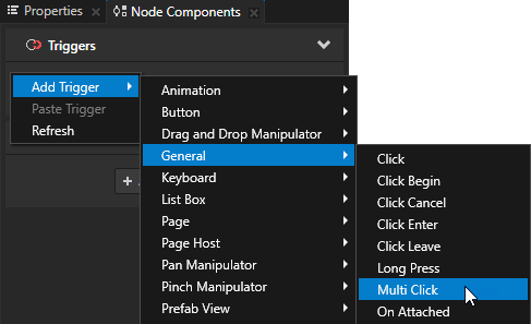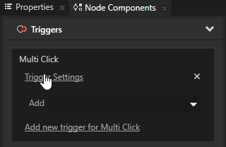3. In the Project select the node to which you want to add the trigger, and in the Node Components > Triggers section add the Multi Click trigger.