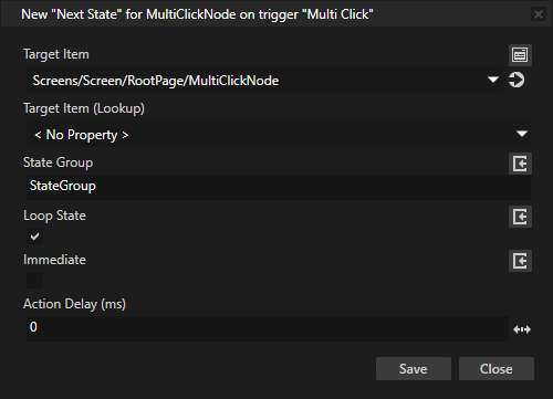 For example, create a state manager where you define the states which set the appearance of a node when the Multi Click trigger is set off repeatedly. See Creating a state manager.