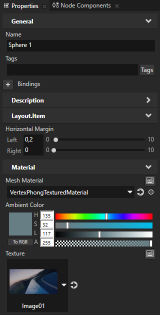 - For each 3D node you selected in the previous step, in the Properties add and set the properties with which you want to change the appearance of the node. Use the properties from the Material category to adjust the materials.