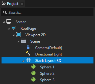 For example, press Alt and right-click the Scene node, create a Stack Layout 3D node and inside it create three Sphere nodes.