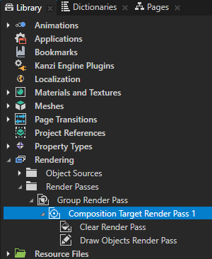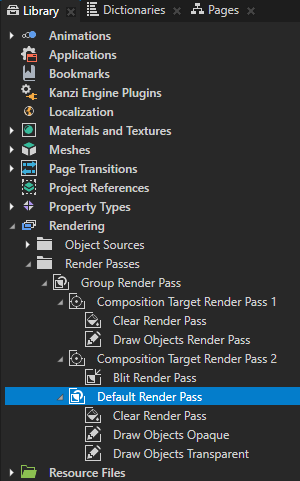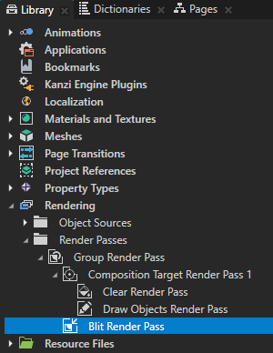 In the Library in the Group Render Pass create a second Composition Target Render Pass and drag the Blit Render Pass to that Composition Target Render Pass. You use the second Composition Target Render Pass to render the first Composition Target Render Pass to a composition target. You create two Composition Target Render Pass render passes because the rendering behavior is undefined if you simultaneously write to and read from the same render pass.