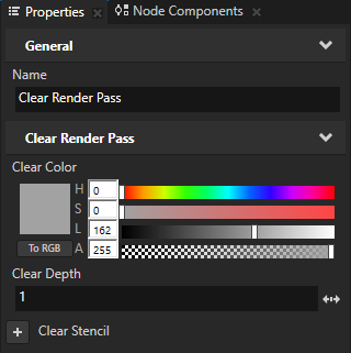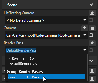 In the Group Render Pass create a Default Render Pass. Default Render Pass creates a basic set of render passes that first render opaque nodes and then transparent nodes. You use this render pass to render to the screen the content of the Scene node.