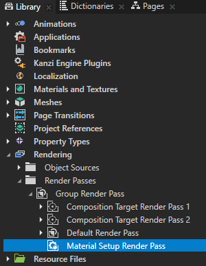 Material Setup Render Pass allows you to set properties for a material so that all successive rendering with that material uses the property values you set in this render pass. For example, use the Material Setup Render Pass to set the output of a Composition Target Render Pass as the texture of a material. See Creating an infinity mirror.