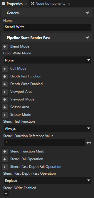 In the Library > Rendering > Render Passes > Stencil Render Pass create a Pipeline State Render Pass, name it Stencil Write, and drag the Draw Stencil render pass to the Stencil Write render pass. You use this render pass to write to the stencil buffer.