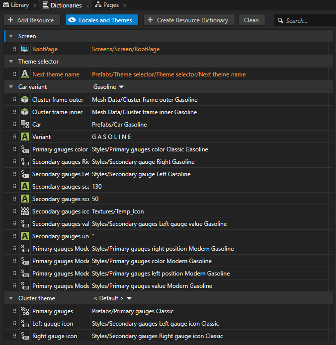 The Dictionaries window shows the resources in the resource dictionaries accessible to the node you select in the Project and the resources in the localization tables and theme groups in the project. See Localization and Theming your applications.