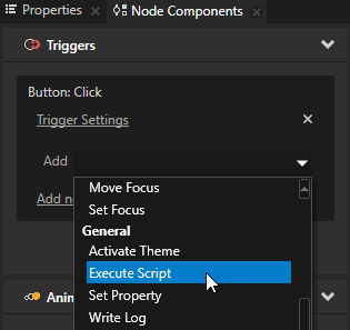- In the Node Components > Triggers section in the trigger you want to use to execute a script, click the dropdown menu, and select the Execute Script action.