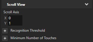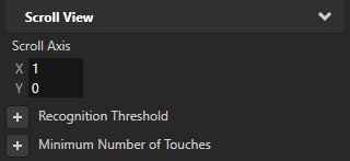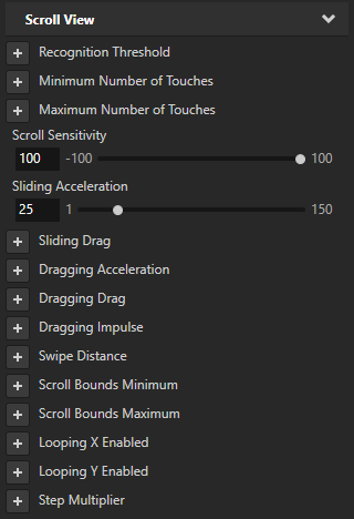 5. (Optional) In the Project select the Scroll View and in the Properties adjust the threshold, acceleration, drag, and other settings to create a scroll view that responds to user input the way you want it to respond: