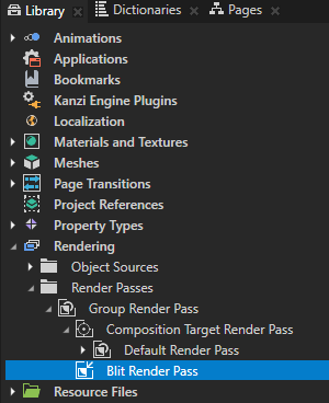 This way you set the Blit Render Pass to draw the contents of the Composition Target Render Pass to the screen using a specific material.