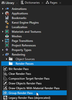 - In the Library > Rendering > Render Passes create a Group Render Pass.