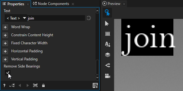 Added to the Text Block nodes the Remove Side Bearings property. Use the Remove Side Bearings property to position the leftmost characters of left-aligned text and rightmost characters of right-aligned text exactly within the boundary of the text block.