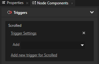3. In the Project select the Scroll View, in the Node Components > Triggers section click + Add Triggers, and in the Add Triggers window add one of the triggers from the Scroll View category.