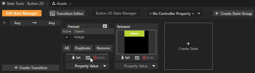 5. In the State Tools set the value of the Controller Property in the Pressed state to True. By doing so your Kanzi application uses the Pressed state when the button is pressed and the Released state when the button is not pressed.