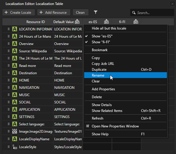 2. In the Localization Editor right-click the header of the locale you want to rename and select Rename.