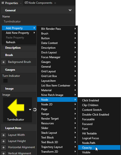 - In the Prefabs select the TurnIndicator prefab, in the Properties right-click, and select Add Property > Node > Opacity.