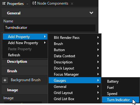 - In the Prefabs select the TurnIndicator prefab, in the Properties right-click, and select Add Property > Gauges > Turn Indicator.