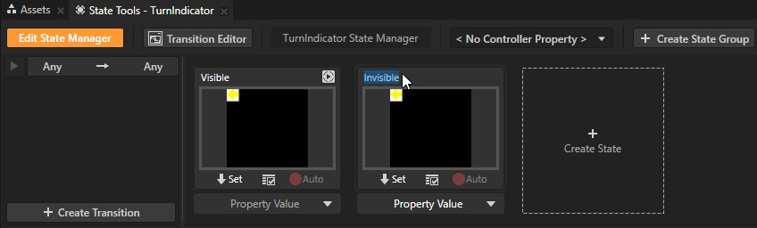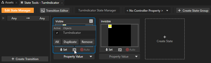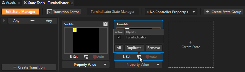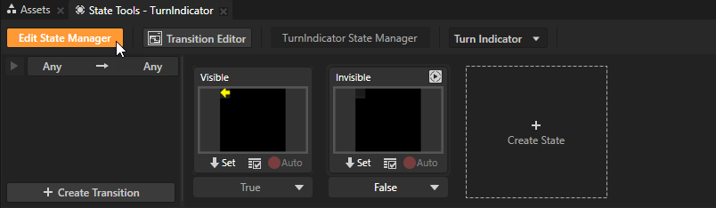 - In the Prefabs select the TurnIndicator prefab, and in the State Tools click Create State Manager.
