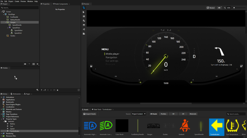 - From the Assets at the bottom of the Kanzi Studio, drag the TurnIndicator image and drop it on the Prefabs window.