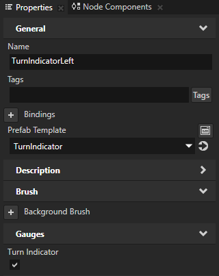 - From the Prefabs drag the TurnIndicator prefab to the Project and drop it on the Gauges node, select the TurnIndicator node, press the F2 key, and name the node TurnIndicatorLeft.