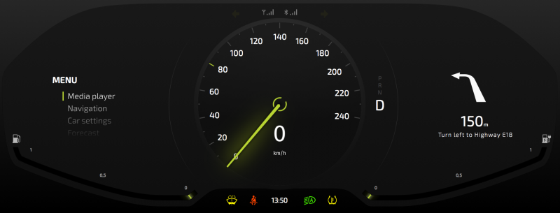 In this tutorial you learned how to create an indicator and control it with a property using the Kanzi state manager. In the Assets of the project you worked on in this tutorial you can find the images for the light, seat belt, tire temperature, and windscreen liquid indicators. You can use the approach you learned in this tutorial to add these indicators below the speed gauge to the left and right of the clock.