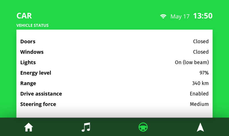- The Car node contains a Grid List Box 2D node which shows the car settings on the Car application screen.